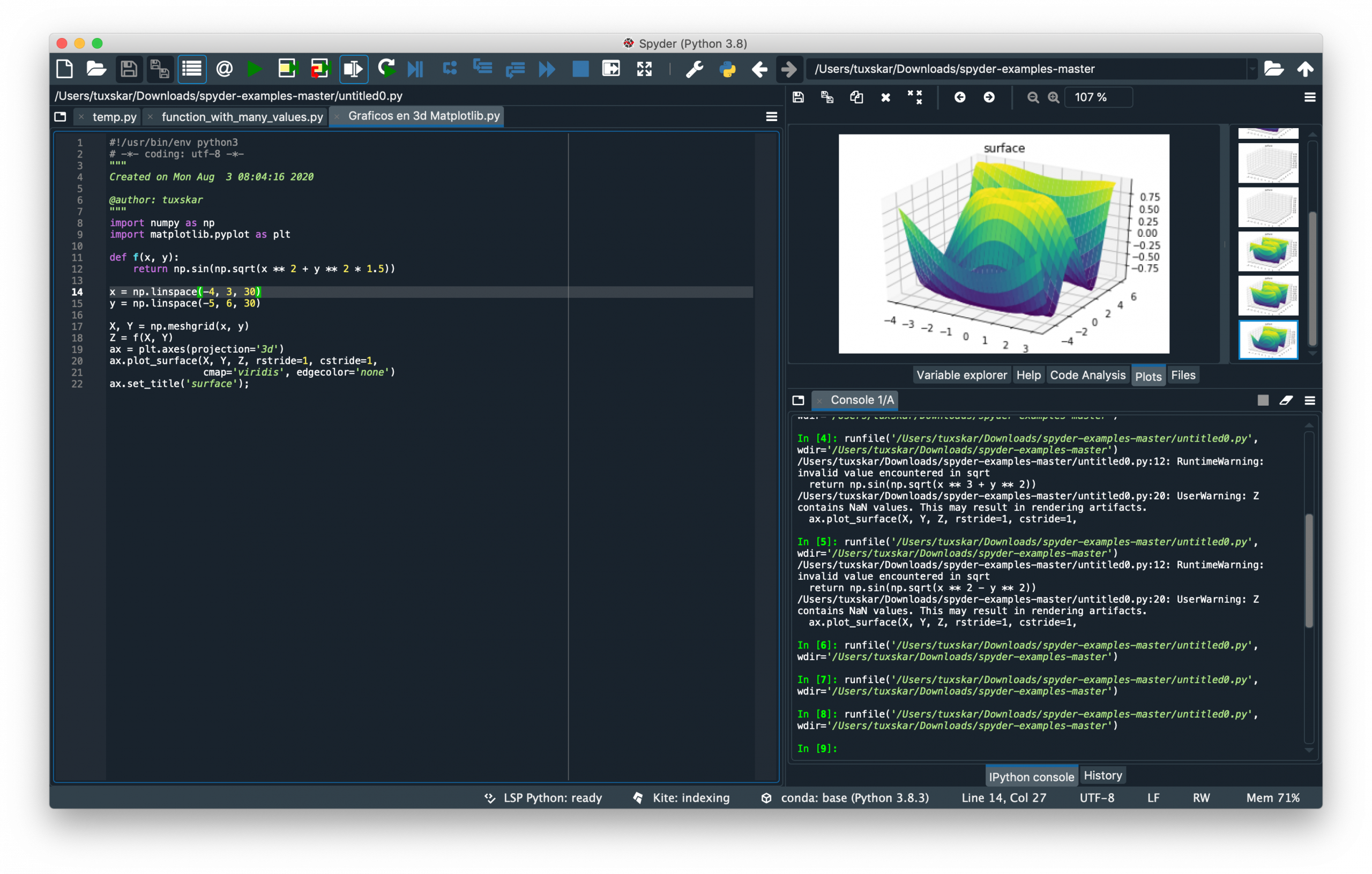 Inicio > Adjunto Graficos en 3D Matplotlib y Spyder Deja una respuesta Cancelar la respuestaTu dirección de correo electrónico no será publicada. Los campos obligatorios están marcados con *Comentario * Nombre * Correo electrónico * Web Guarda mi nombre, correo electrónico y web en este navegador para la próxima vez que comente. Publicar un comentario